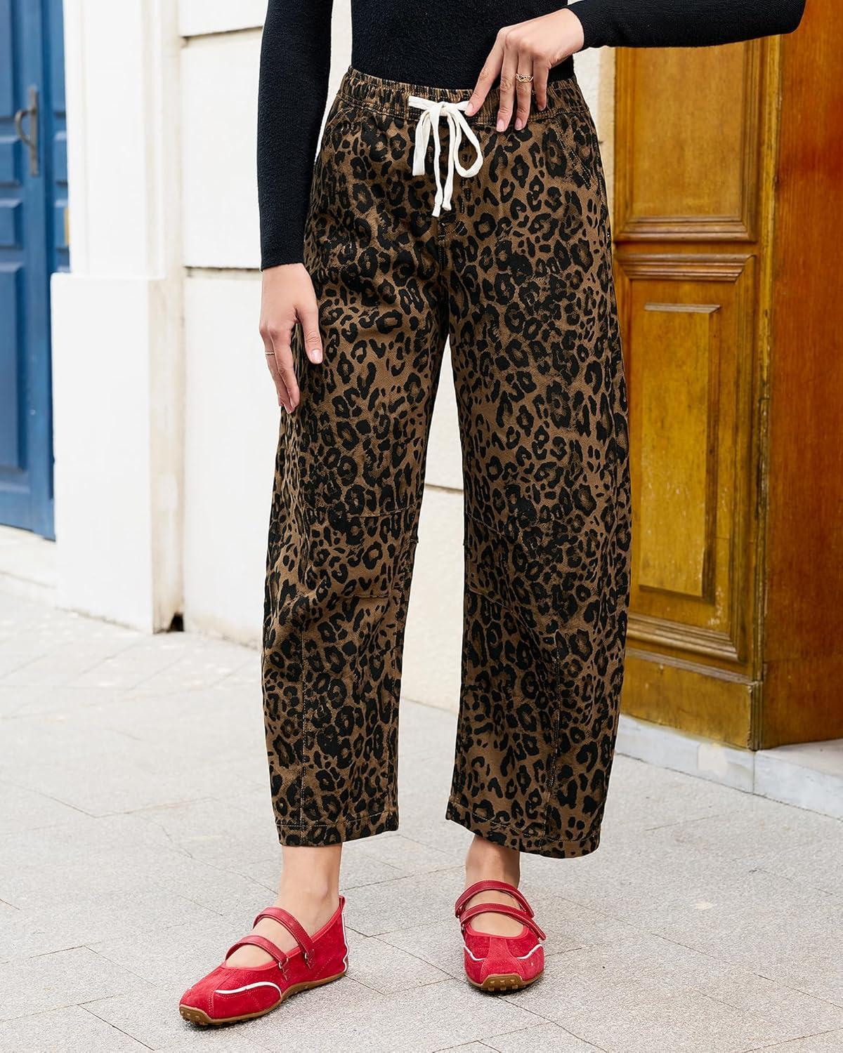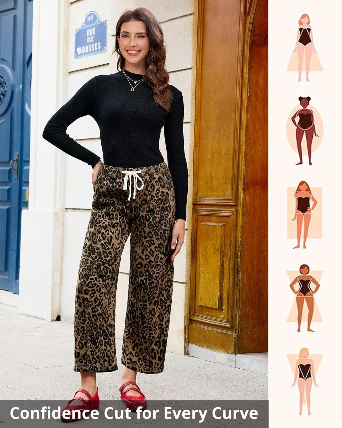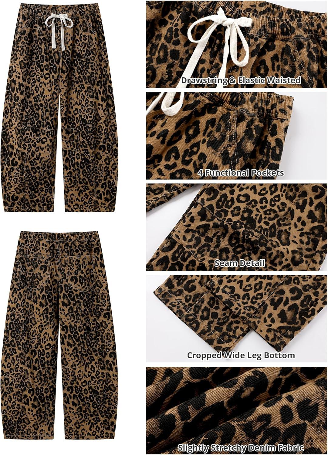GRAPENT Barrel Jeans for Women Trendy High Waisted Pull On Wide Leg Cropped Leopard Cheetah Print Stretchy Denim Pants(Bronze Leopard)