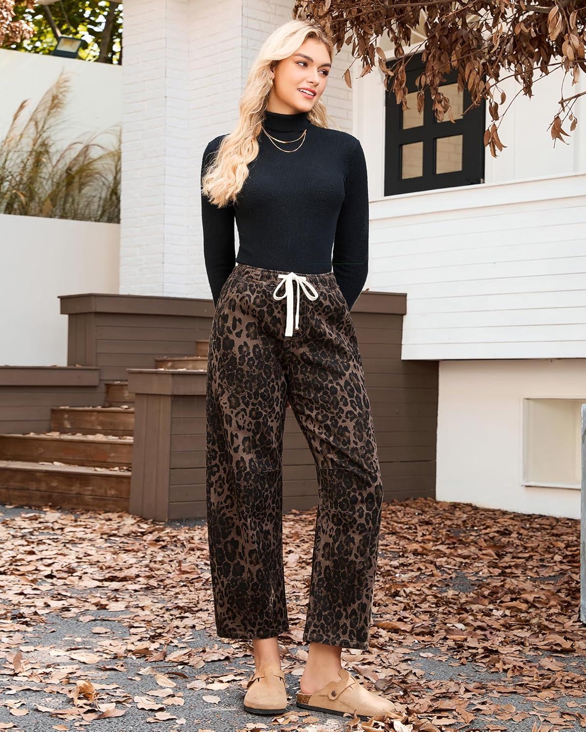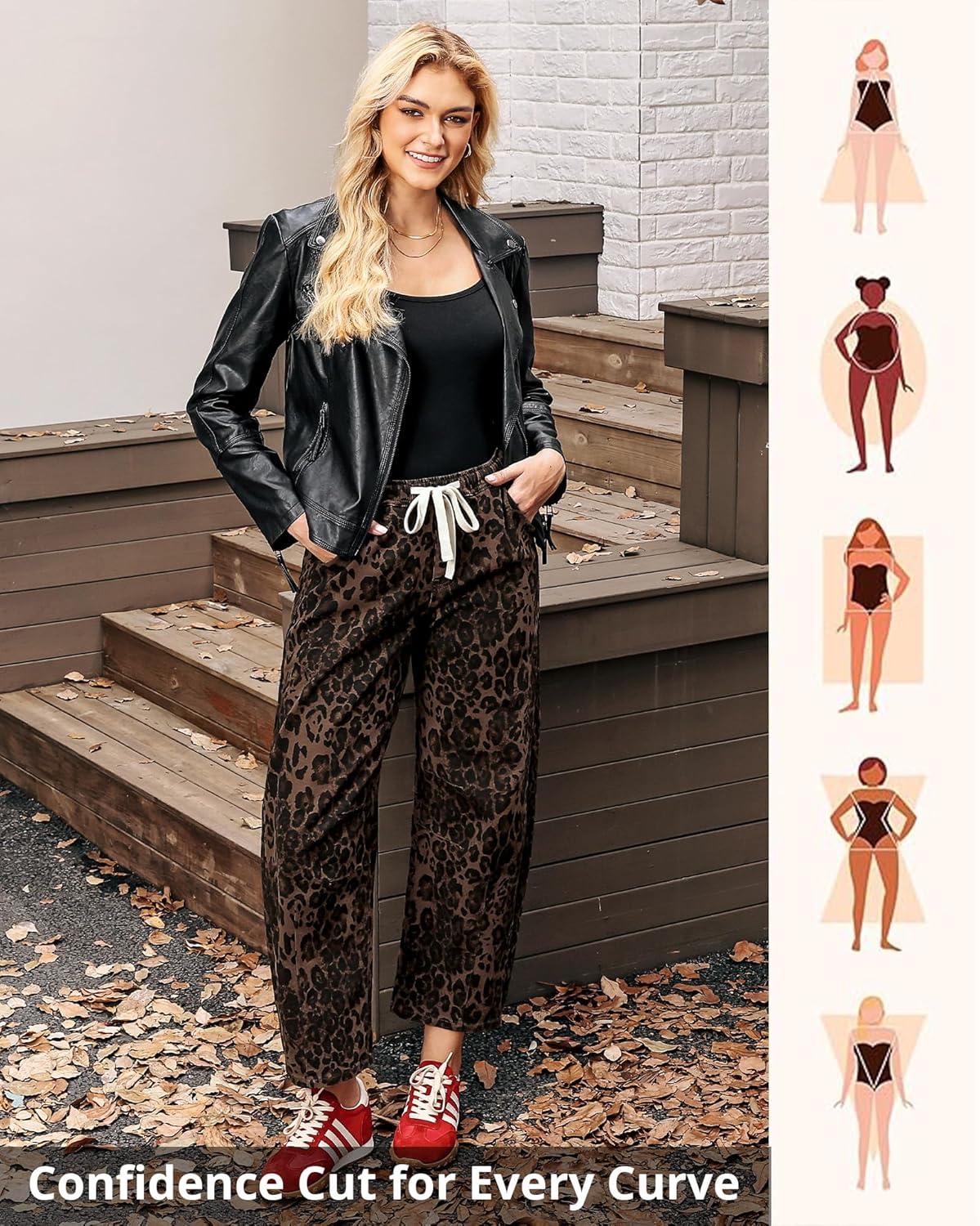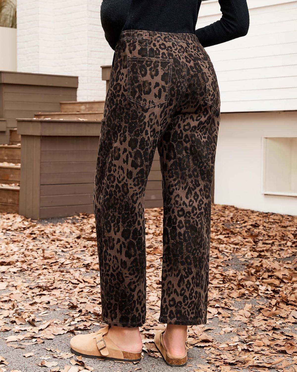 GRAPENT Barrel Jeans for Women Trendy High Waisted Pull On Wide Leg Cropped Leopard Cheetah Print Stretchy Denim Pants(Brown Leopard)