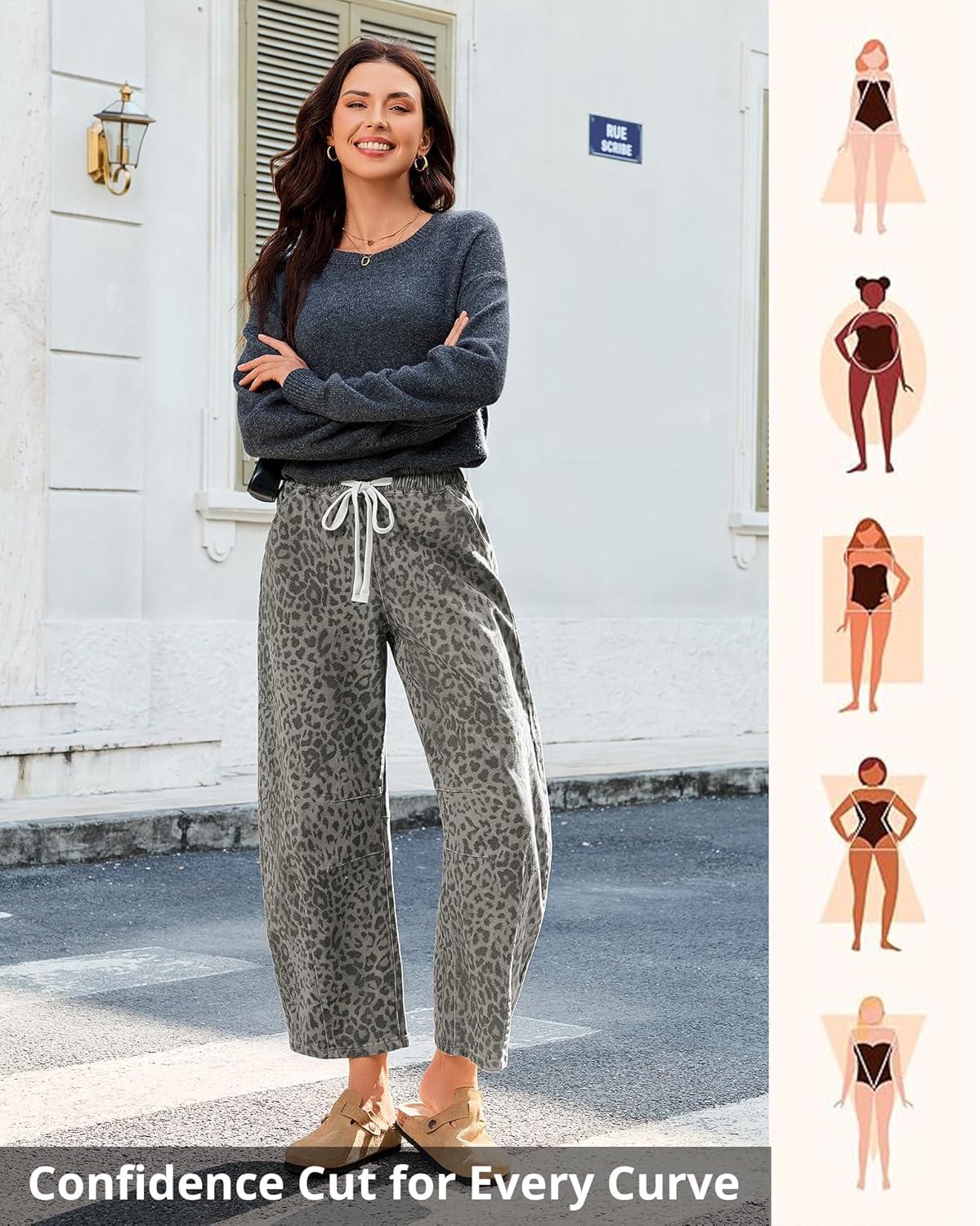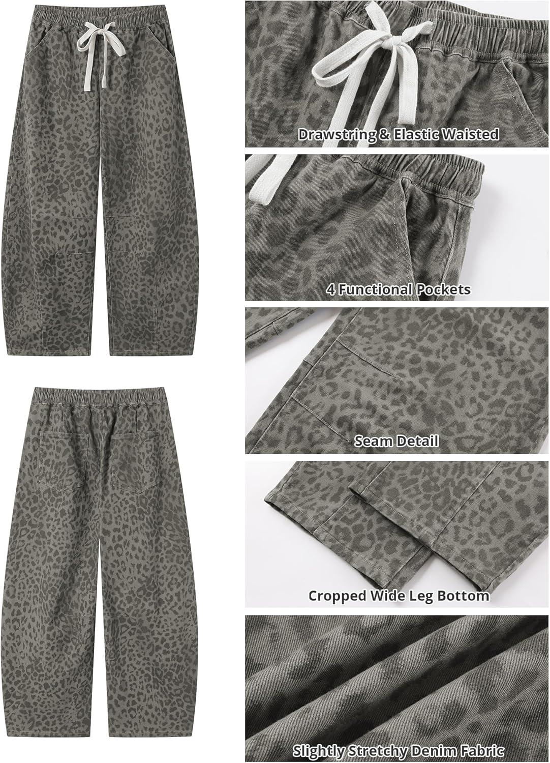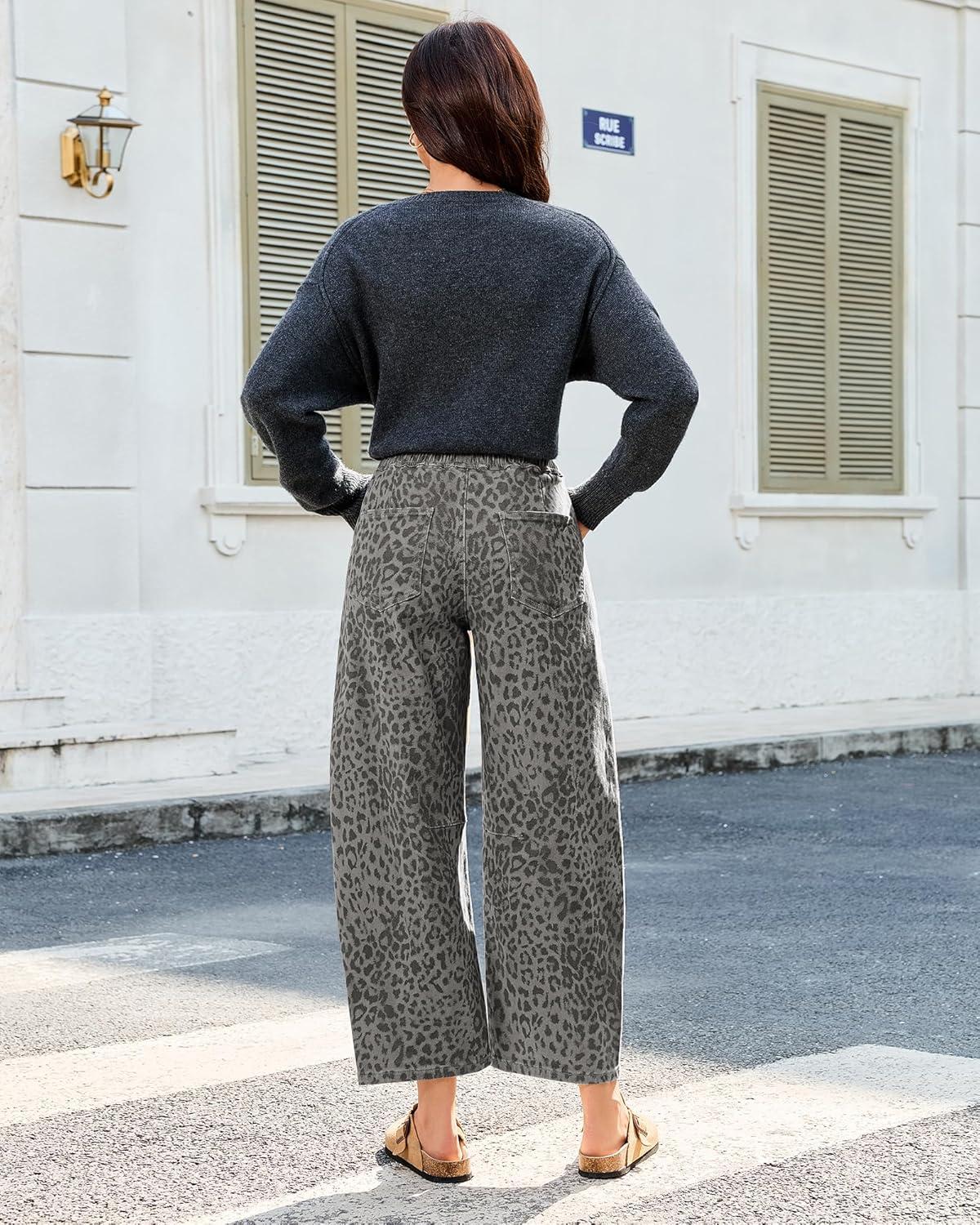 GRAPENT Barrel Jeans for Women Trendy High Waisted Pull On Wide Leg Cropped Leopard Cheetah Print Stretchy Denim Pants(Gray Leopard)