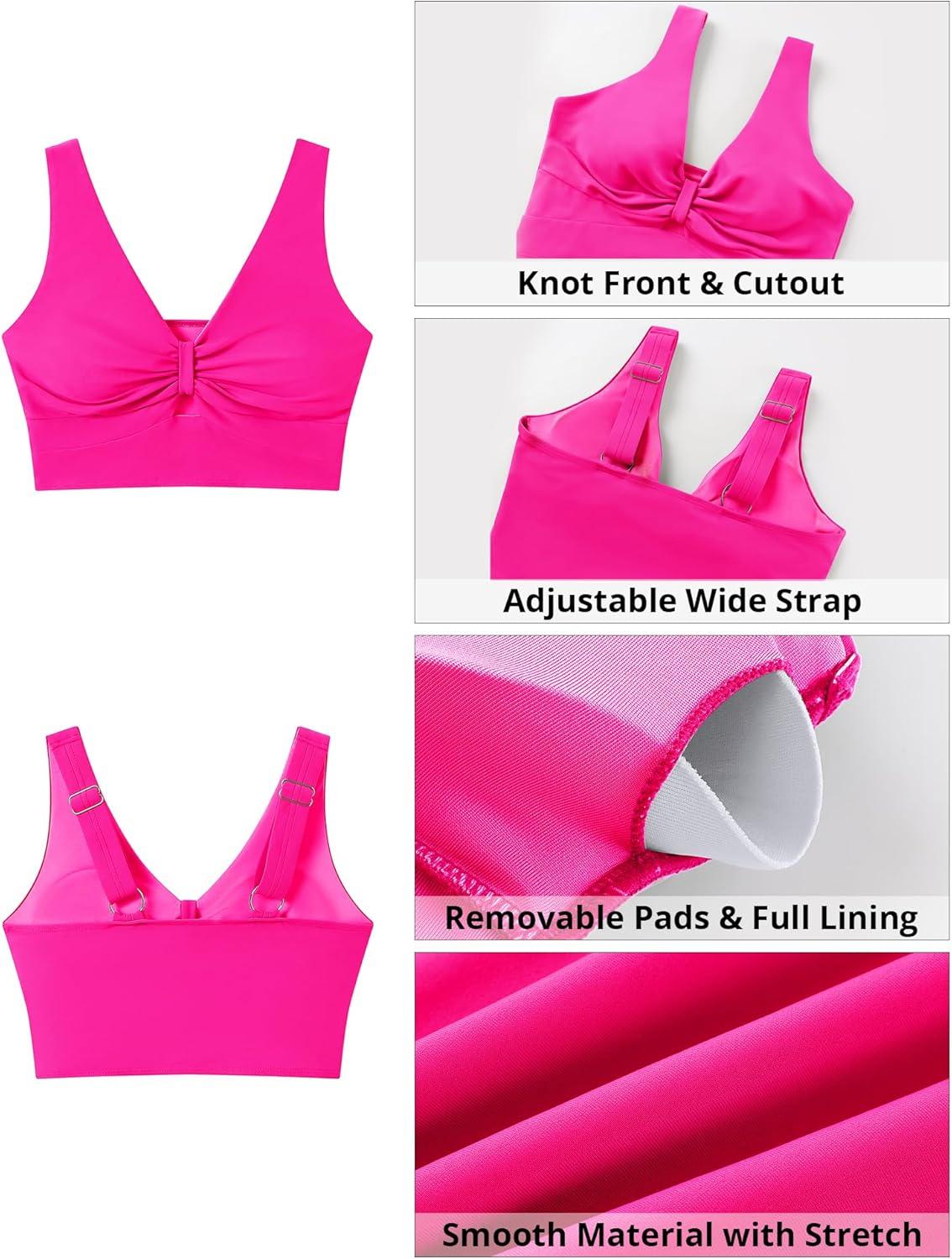 GRAPENT Bikini Tops for Women Cropped Tankini Tops Beach Ruched Knot Cut Out Padded Adjustable Swimwear Swim Top Only(Neon Pink)