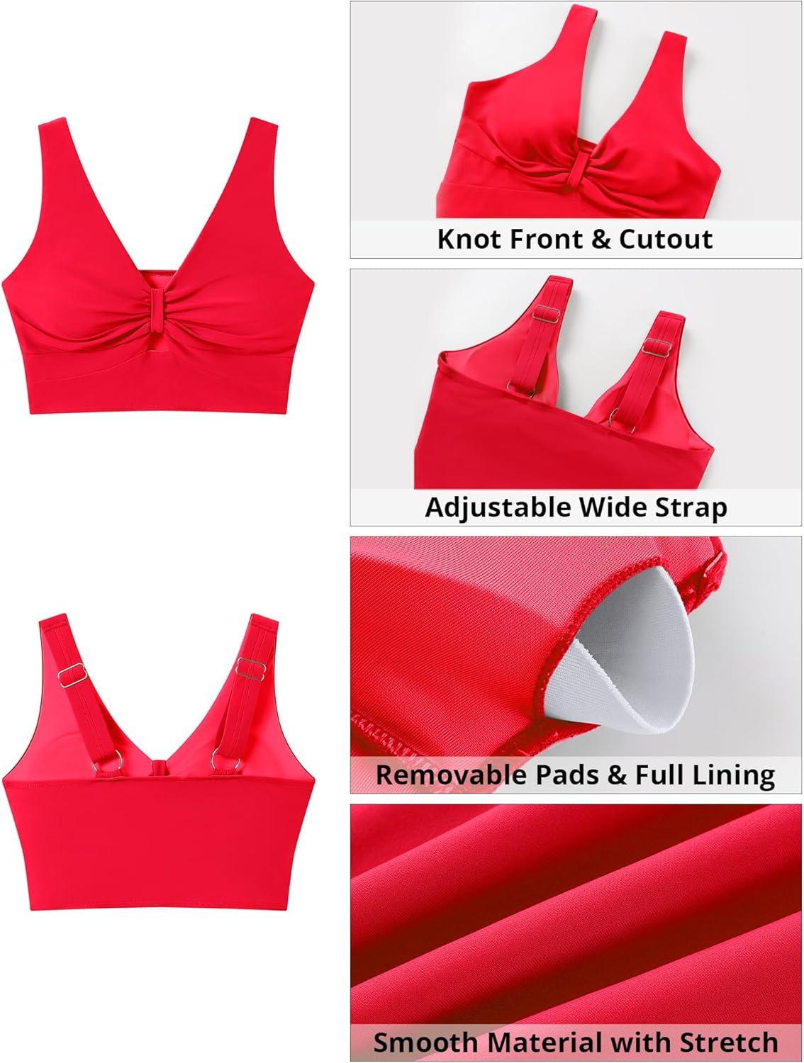 GRAPENT Bikini Tops for Women Cropped Tankini Tops Beach Ruched Knot Cut Out Padded Adjustable Swimwear Swim Top Only(Red)