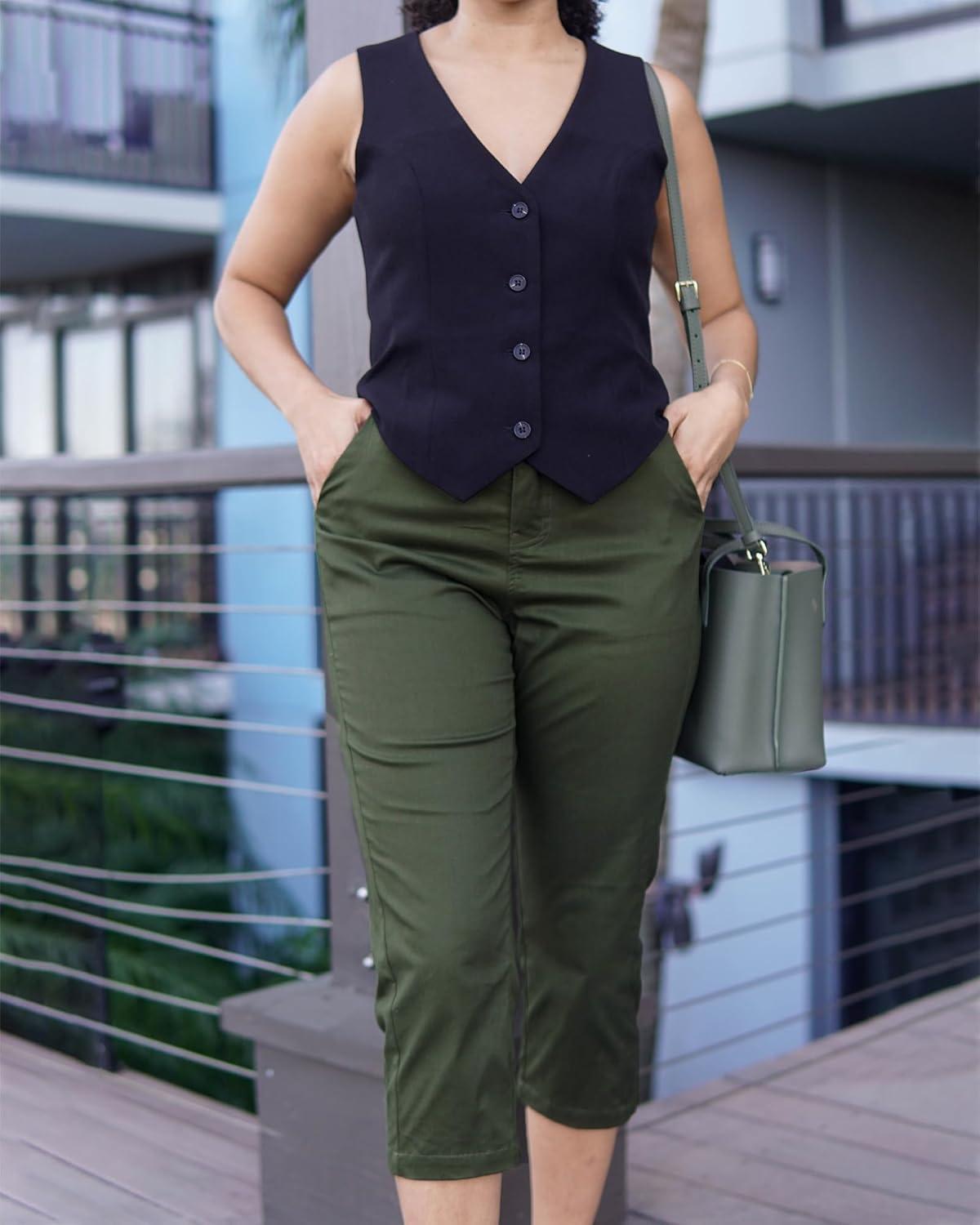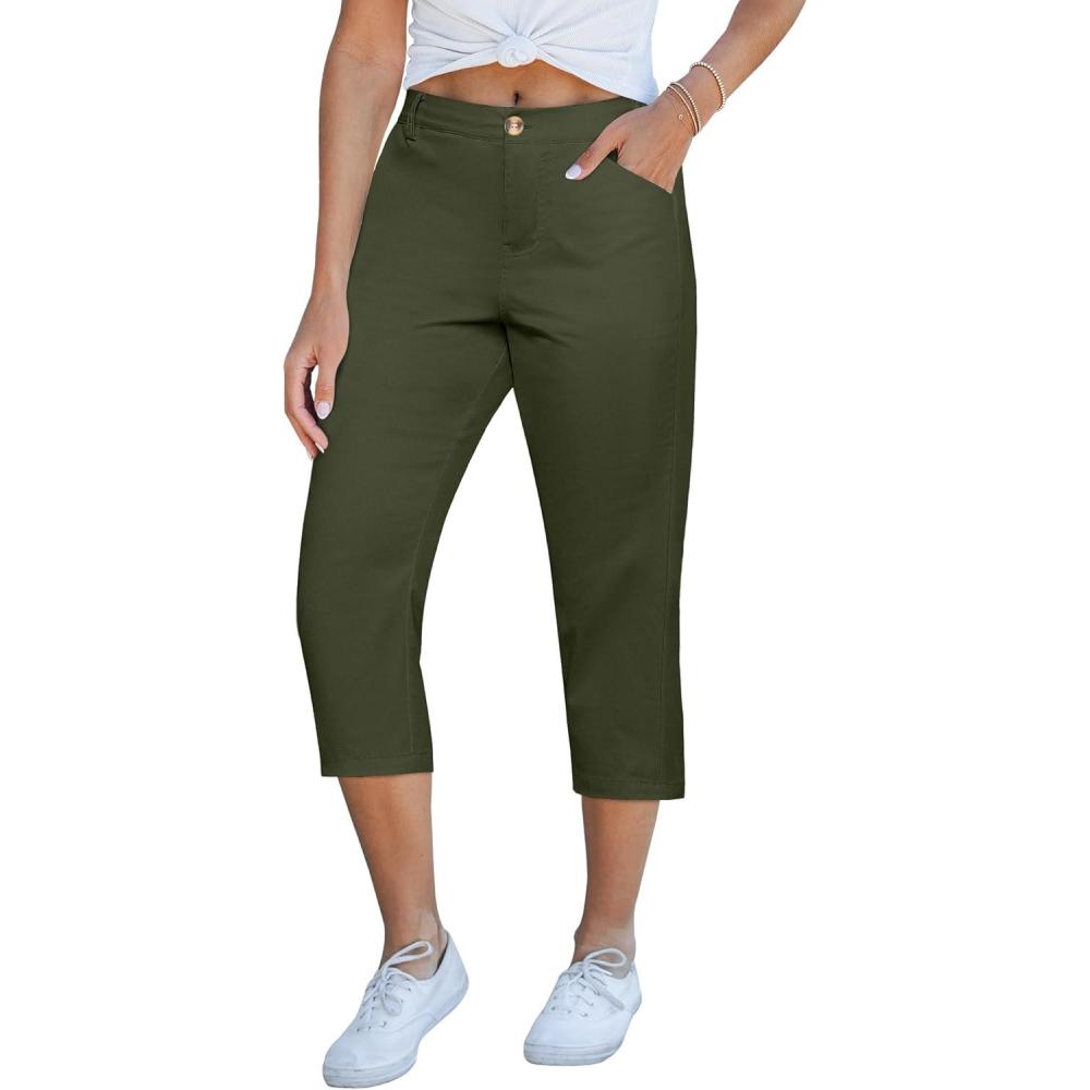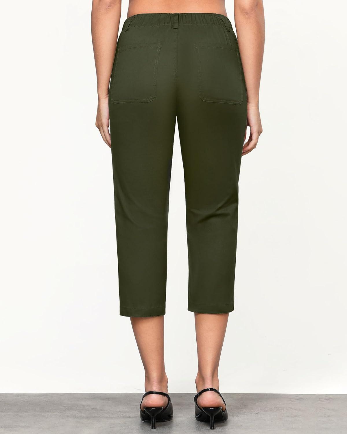 GRAPENT Capri Pants for Women Summer High Waisted Cotton Elastic Waist Dressy Casual Office Work Capris Trousers Pants(Dark Olive)
