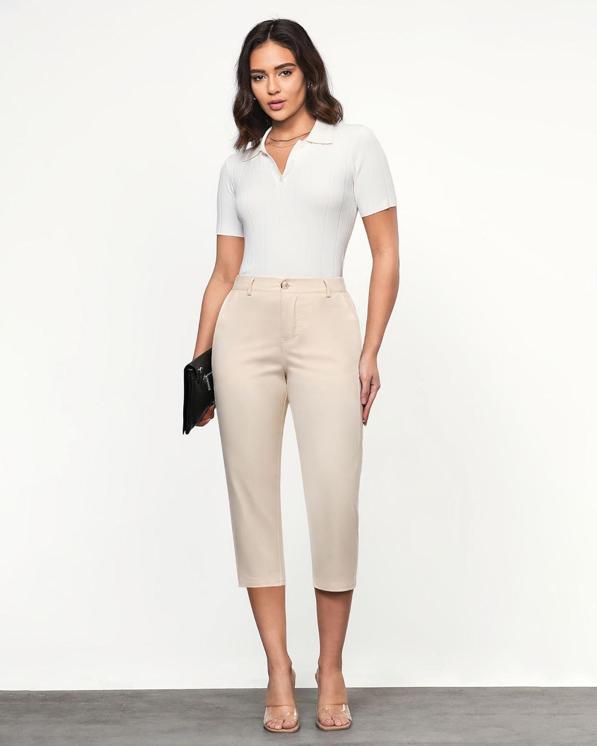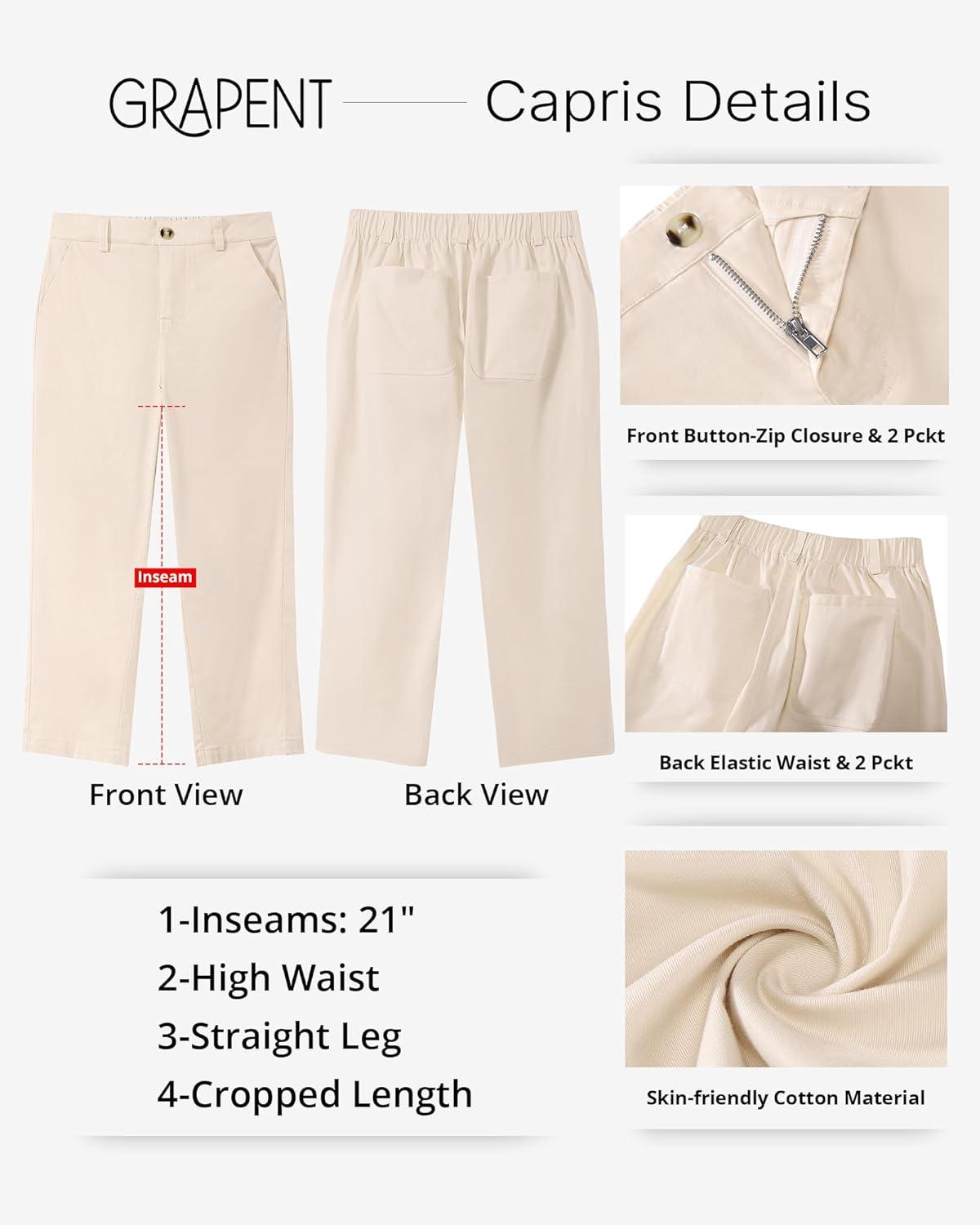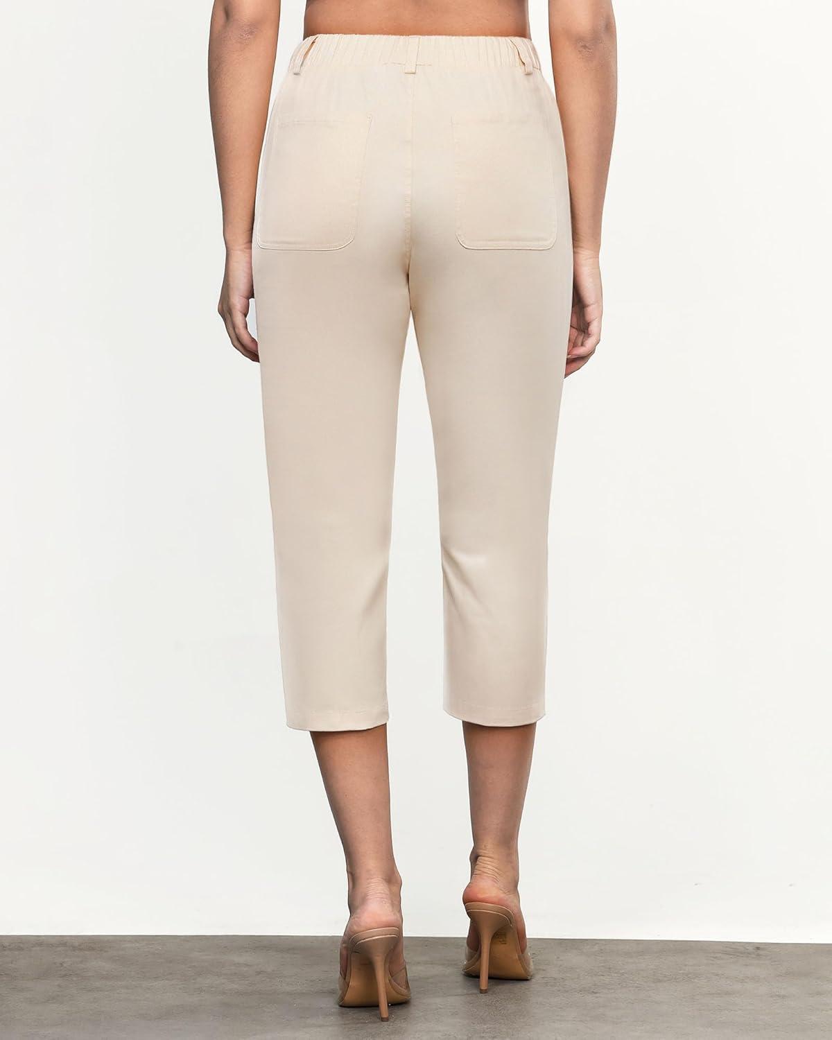 GRAPENT Capri Pants for Women Summer High Waisted Cotton Elastic Waist Dressy Casual Office Work Capris Trousers Pants(Macadamia)