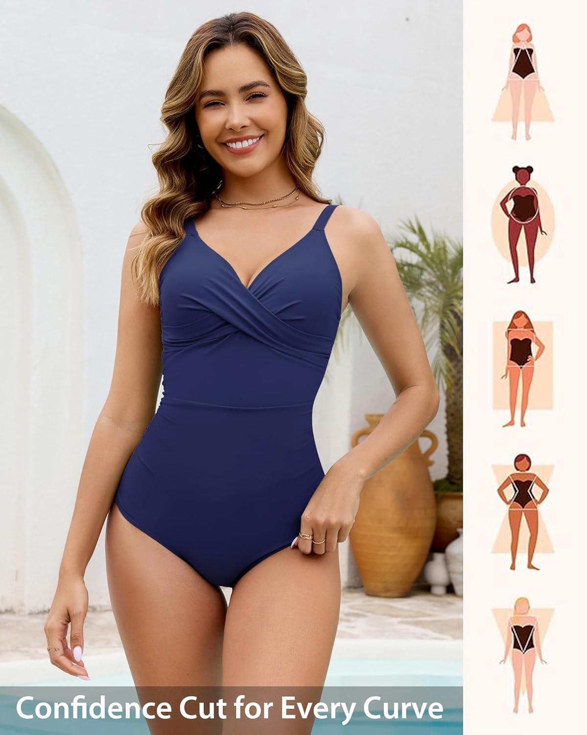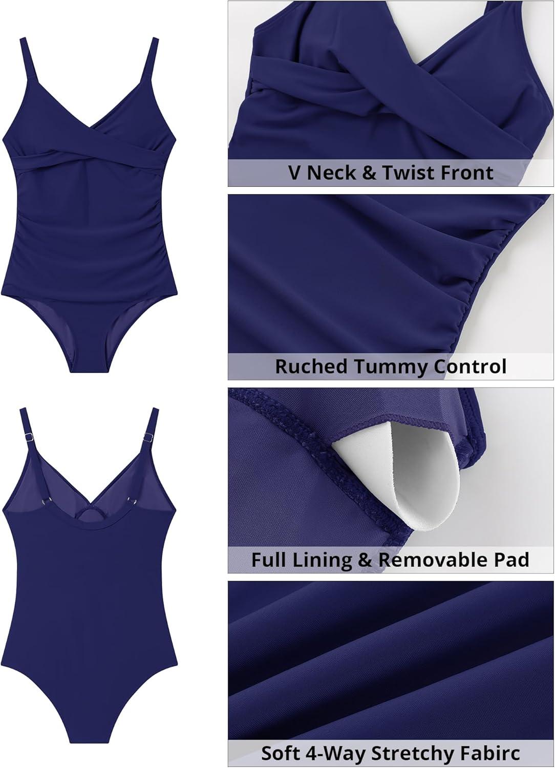 GRAPENT One Piece Swimsuit Women Ruched Twist Front Padded Modest Full Coverage Swim Bathing Suit Swimwear Swimsuits(Navy Blue)